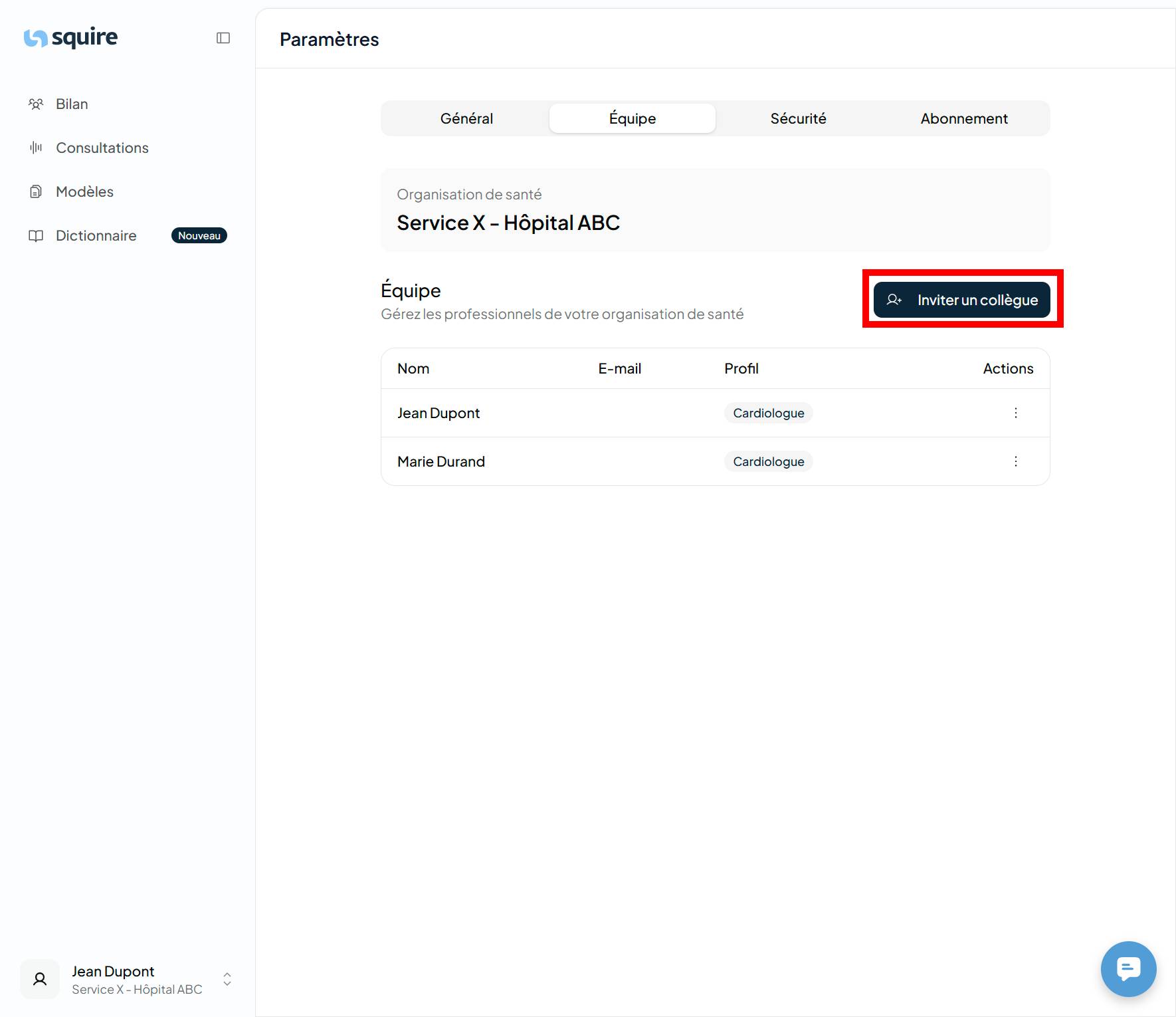 Élargissez votre équipe en invitant des collègues via les paramètres d'organisation de Squire.