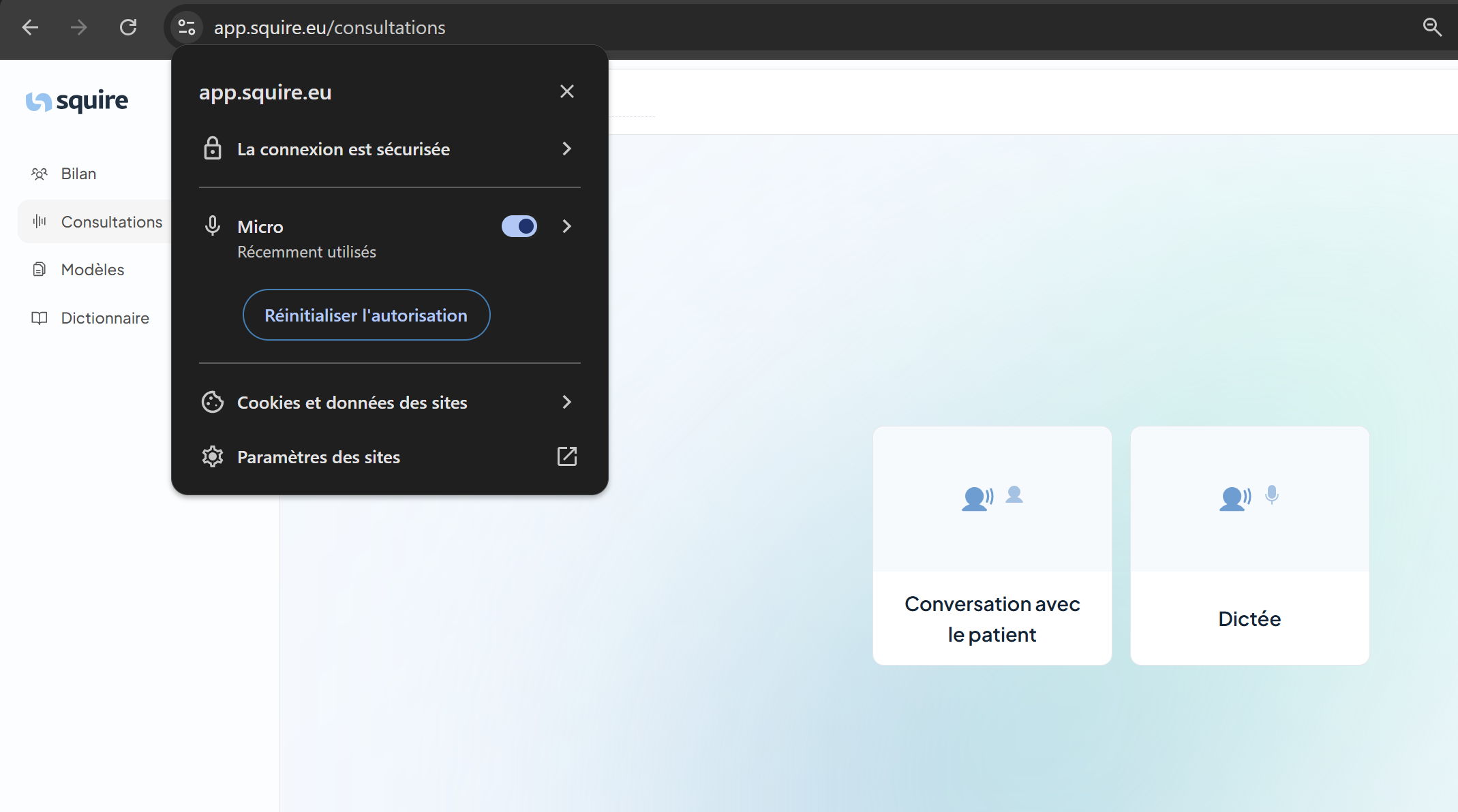Apprenez comment connecter le microphone Squire et choisir les réglages appropriés dans l’écran de consultation pour la meilleure qualité d’enregistrement (grand impact sur le compte rendu généré). Pour plus d’informations sur le microphone Squire, cliquez ici.