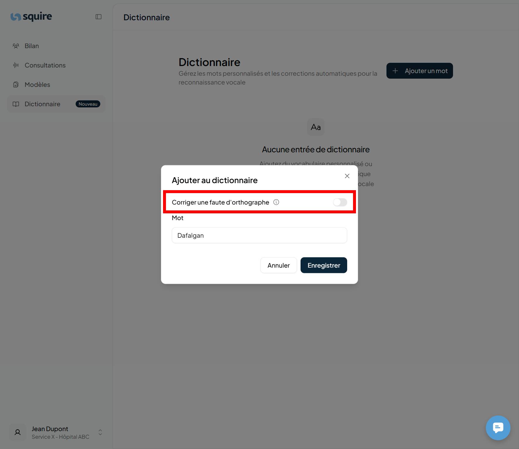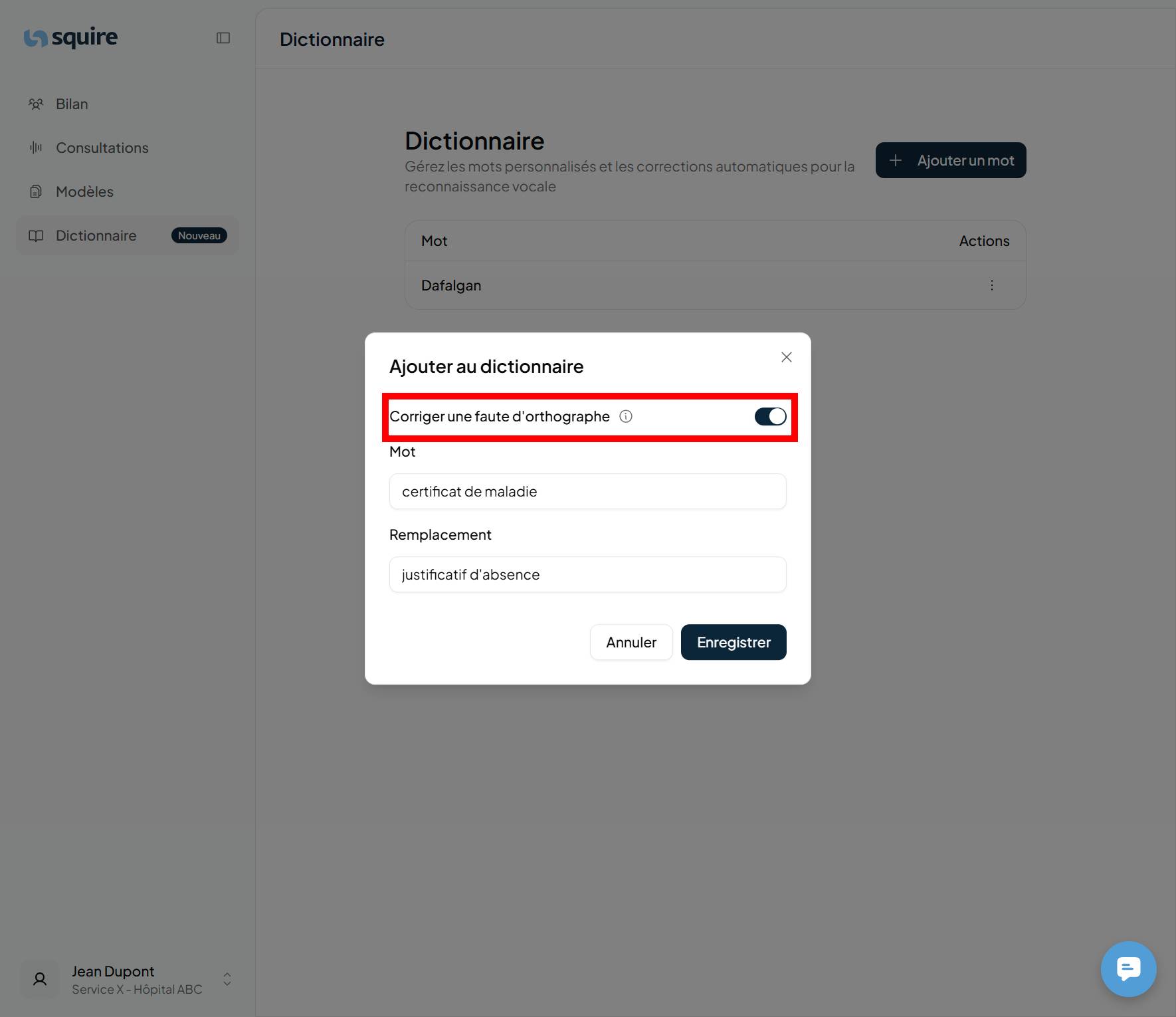 Parfois, des noms spécifiques (comme des médicaments) ne sont pas écrits correctement tout de suite, ou vous souhaitez qu’un mot que vous prononcez souvent dans votre rapport apparaisse toujours sous forme d’un terme médical officiel. Le dictionnaire vous offre ce contrôle.
