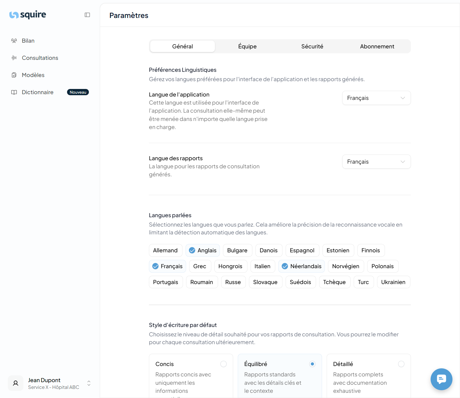 Voici la langue dans laquelle Squire rédige vos rapports médicaux et résumés.