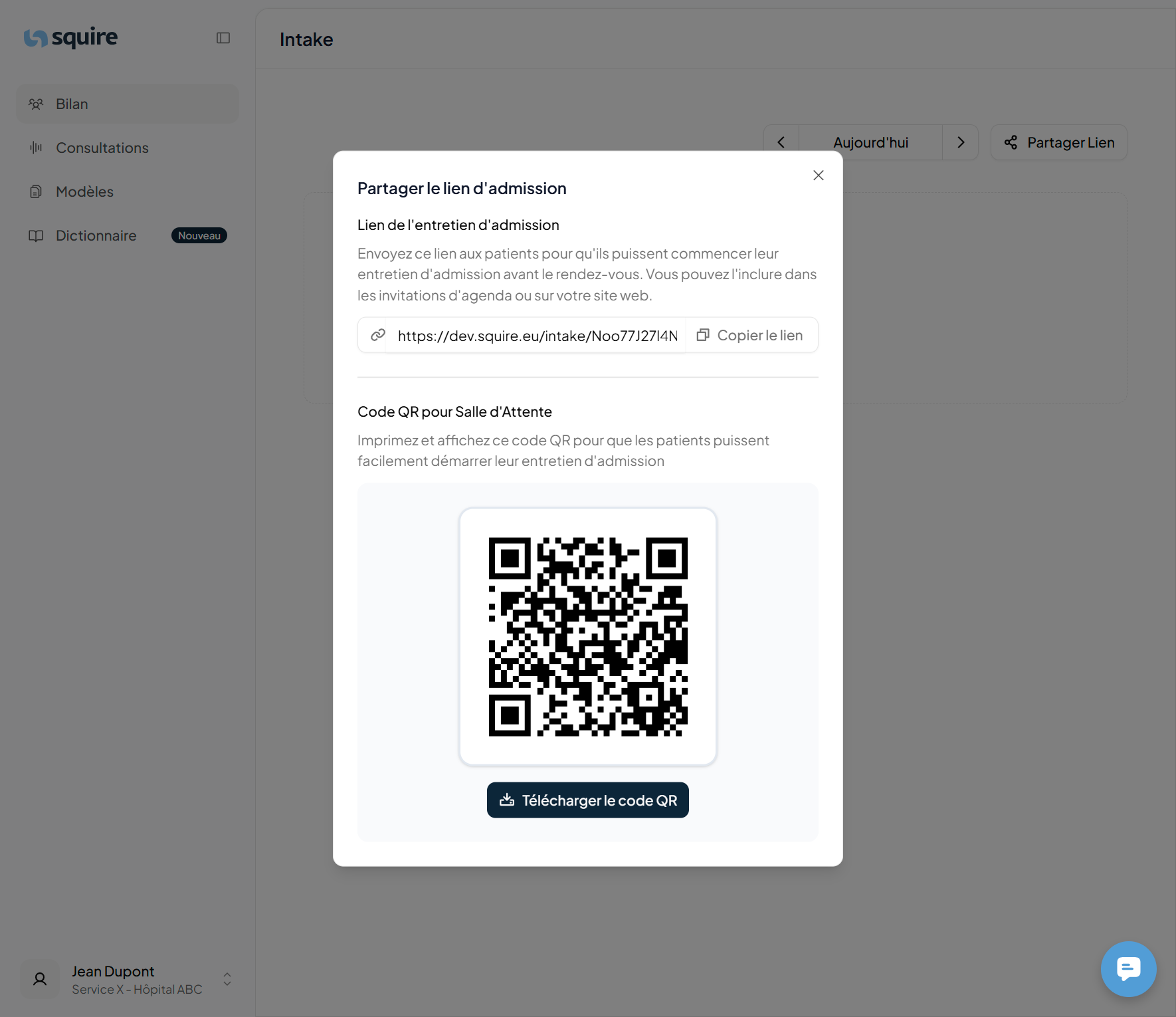 Le QR-code : Téléchargez le QR-code et accrochez-le dans un endroit visible dans la salle d’attente. Les patients peuvent scanner le code avec leur smartphone et démarrer le chat ou l’entretien tout de suite pendant qu’ils attendent. Le cas échéant, vous pouvez avertir votre secrétaire qu’il/elle doit informer les patients qu’ils doivent effectuer une conversation avec l’assistant Squire avant leur consultation afin que le médecin soit bien préparé.