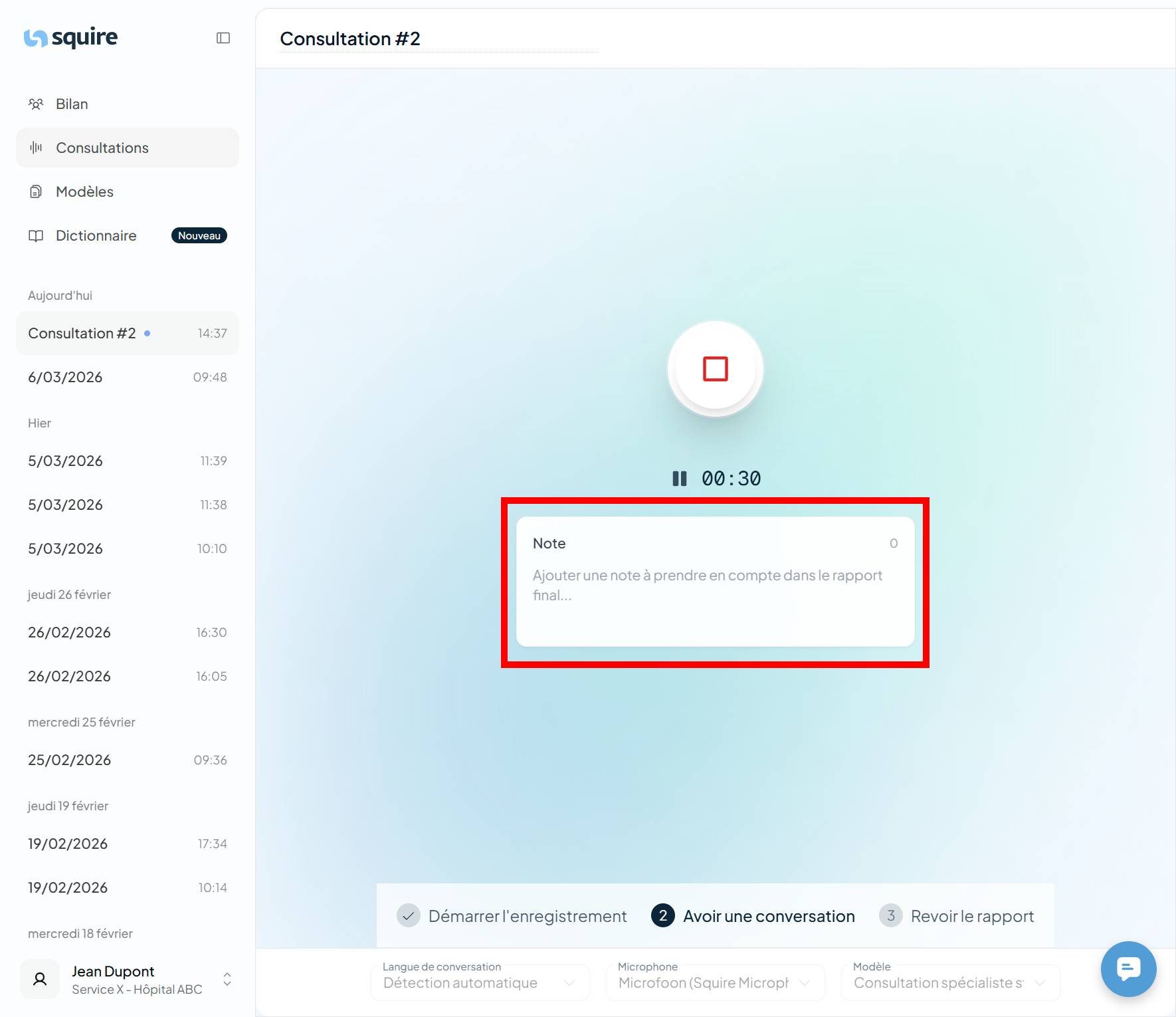 Dès que la consultation est terminée et que le rapport est généré, vos notes écrites restent accessibles.