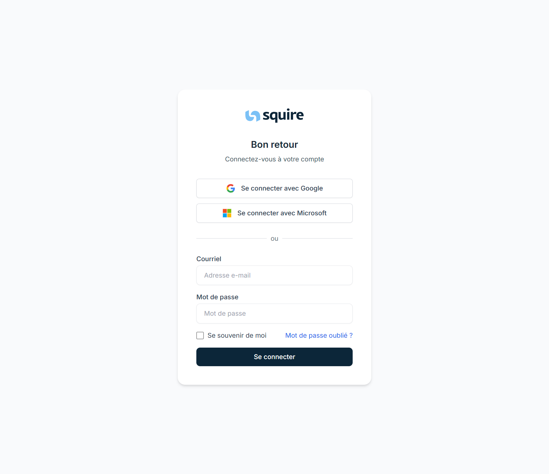Ouvrez votre navigateur et allez à : https://app.squire.eu/ (ou via l’application installée ou l’application mobile)