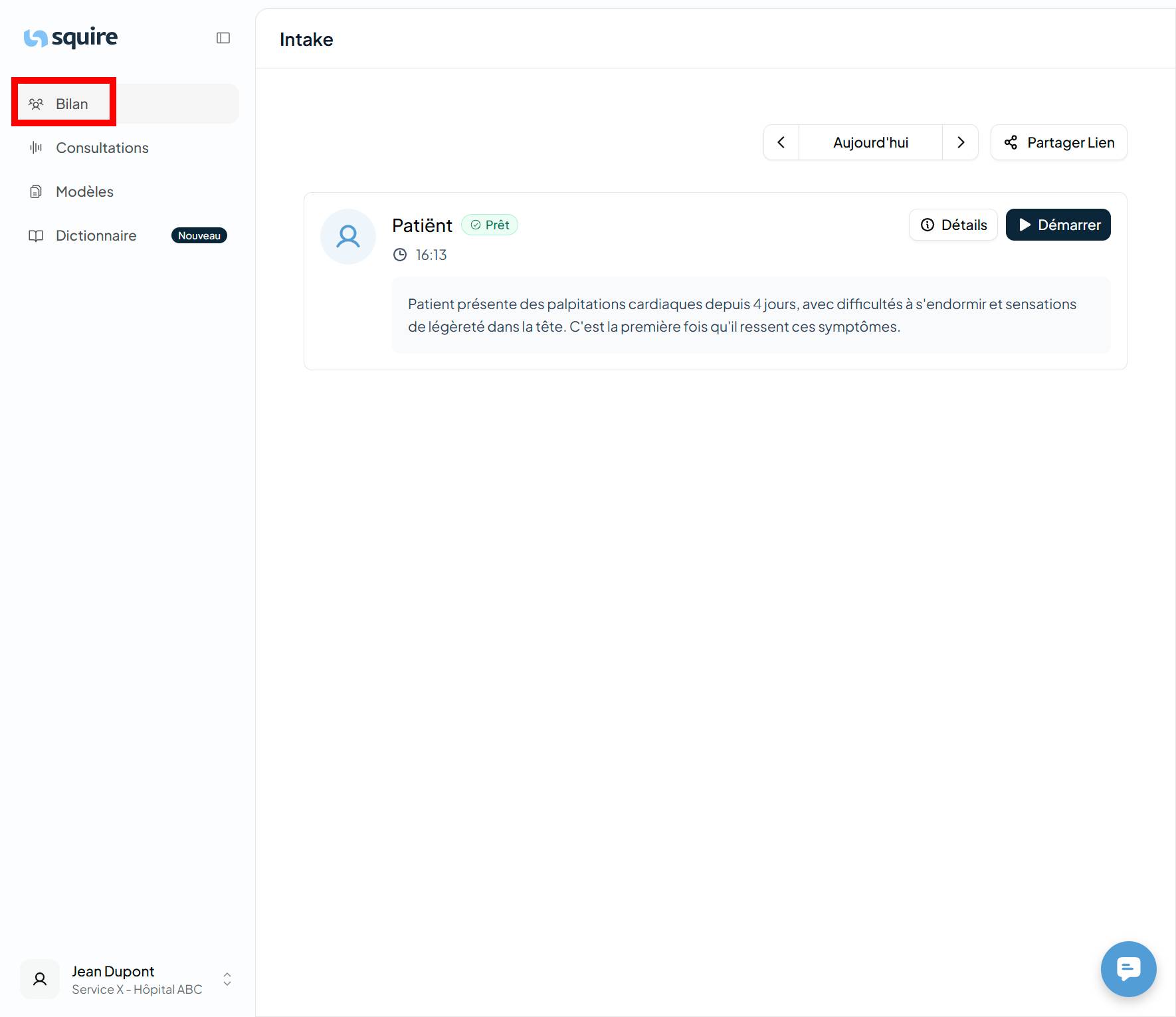 Toutes les informations que le patient partage avec l'assistant Squire sont synchronisées directement et préparées de manière claire pour vous dans le menu d'accueil.