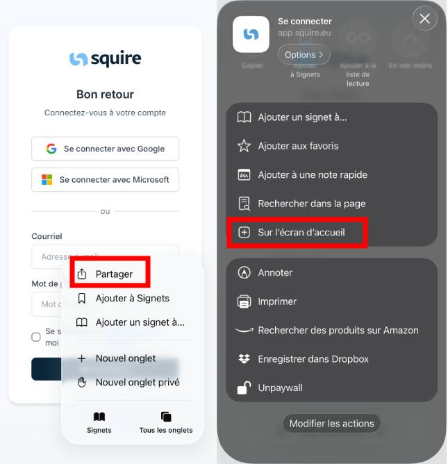 Touchez en haut à droite « Ajouter ». Squire est désormais directement accessible depuis votre écran d’accueil.